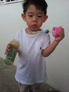 After bathed, he is blowing bubbles.